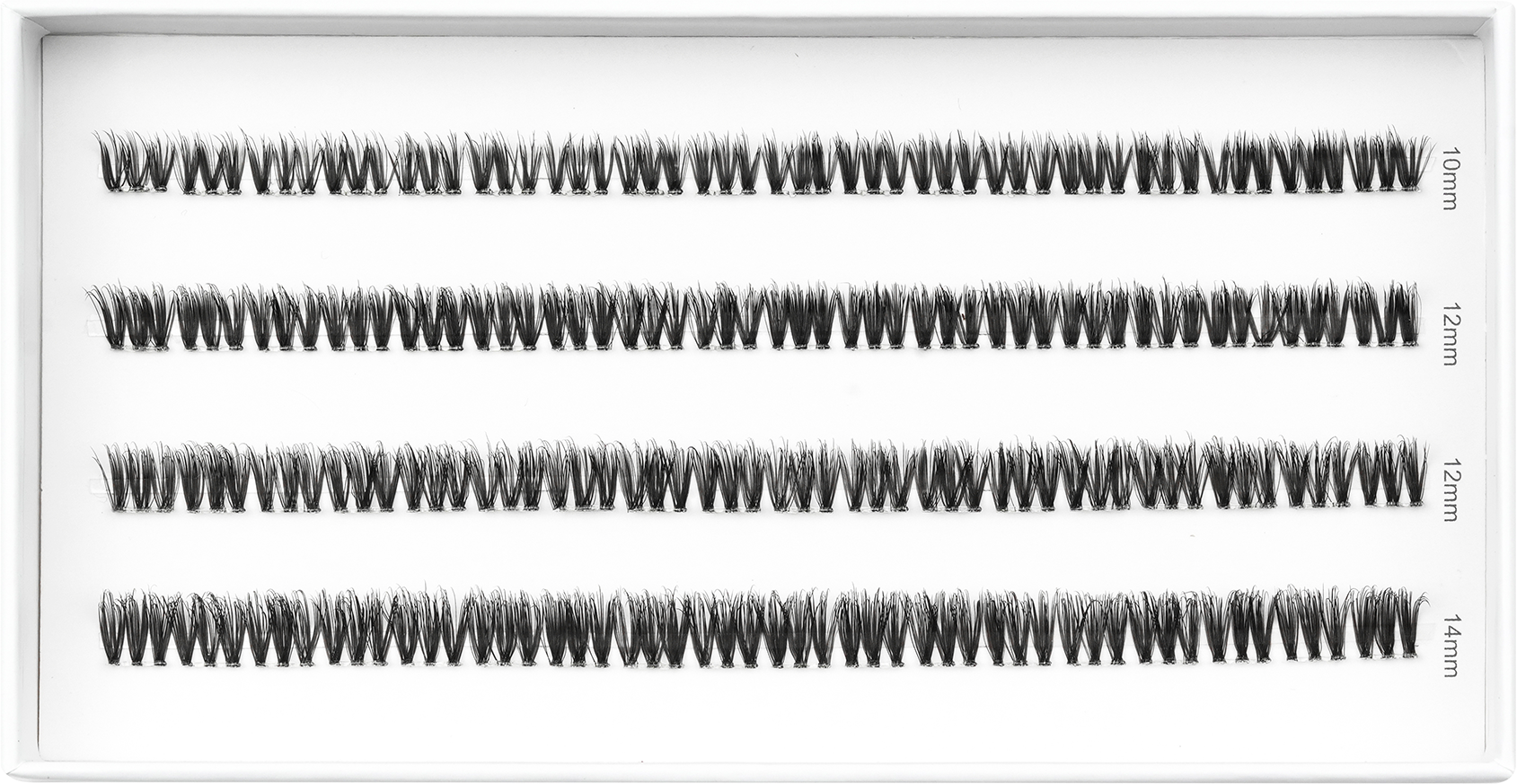 This eyelash pack contains 72 self-adhesive, vegan eyelash clusters in sizes 10 mm, 12 mm and 14 mm. The lashes can be reused up to 5 times. Eyelash glue is not required. They are simply glued underneath the natural lashes.
