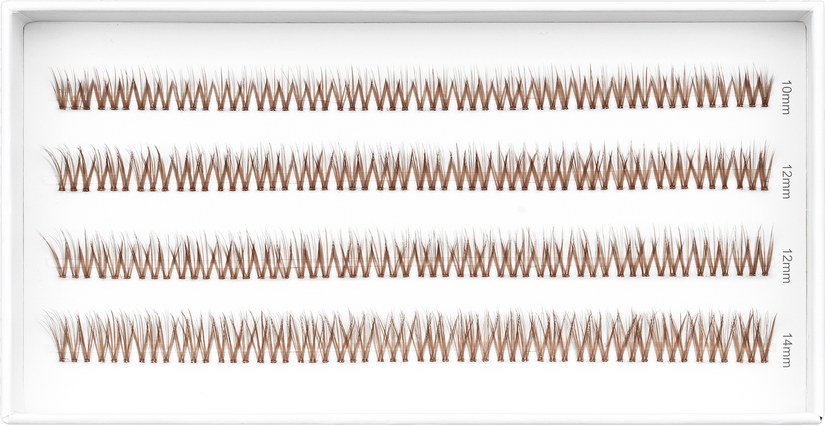 This eyelash pack contains 72 self-adhesive, vegan eyelash clusters in sizes 10 mm, 12 mm and 14 mm. The lashes can be reused up to 5 times. Eyelash glue is not required. They are simply glued underneath the natural lashes.