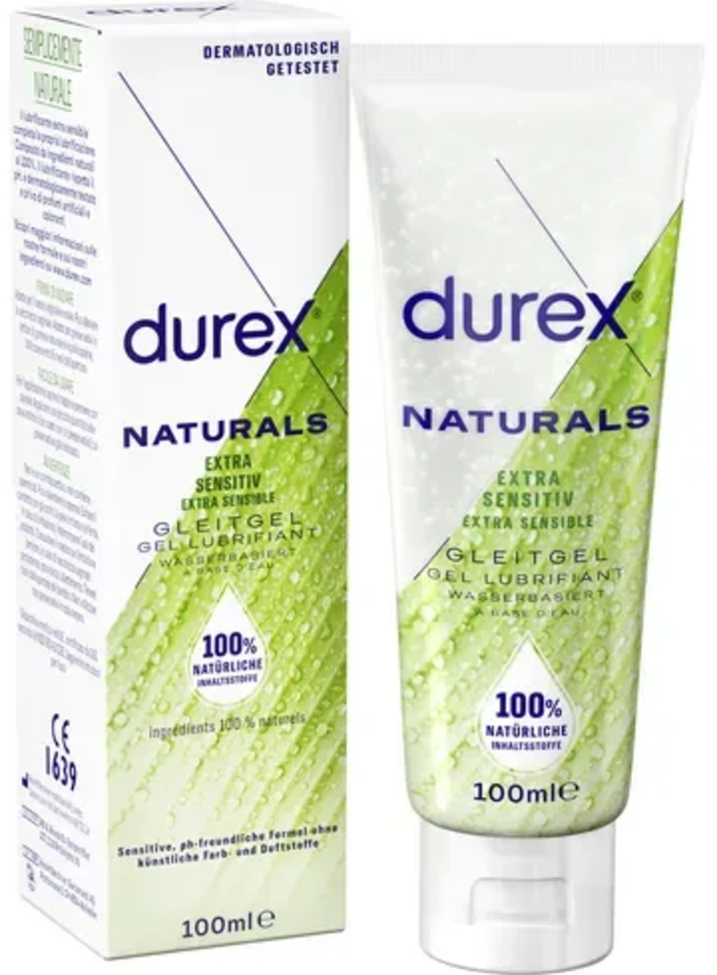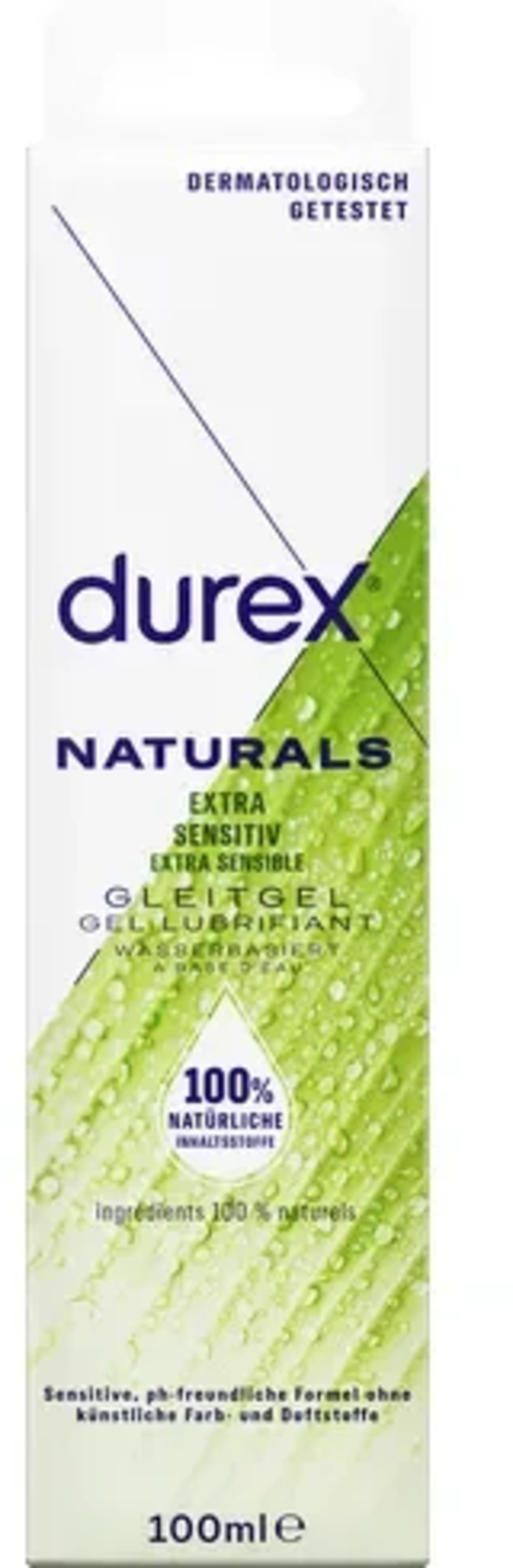 Gentle lubricant made from purely natural ingredients with aloe vera extract. The water-based formulation is free from fragrances and dyes. It can easily be used in combination with Durex condoms (made of natural rubber latex and polyisoprene) and Durex sex toys.