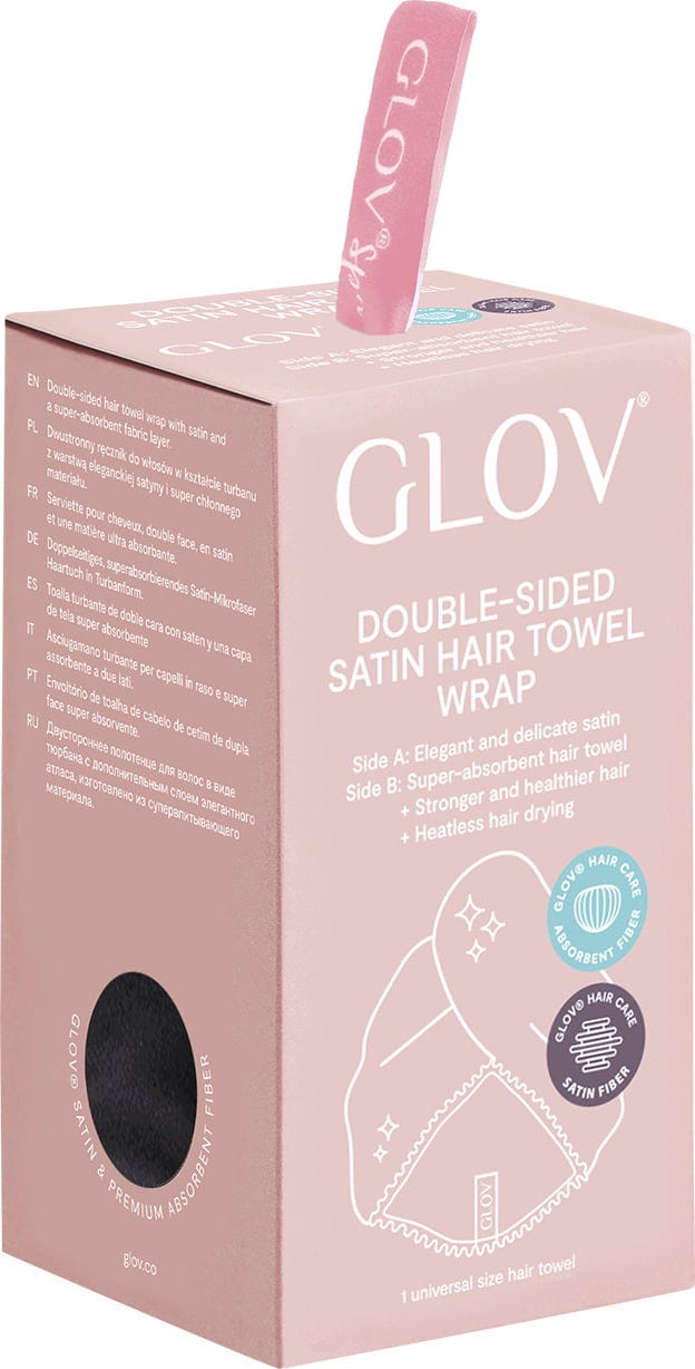 The reversible turban can be worn on both sides. The super-absorbent GLOV® microfibre absorbs moisture after washing the hair while the satin side can be worn outdoors. When the satin side is reversed, it prevents hair breakage, frizz and tangling. The hair wrap is ideal for curly hair or can be worn as a sophisticated accessory outdoors for a clean and polished look when the hair is wet.