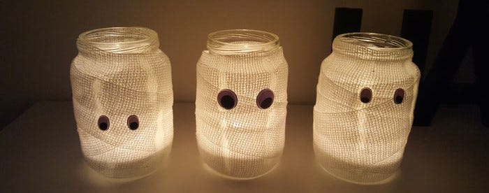 • An old pickle jar makes for a perfect mummy tea light holder. Just wrap an old gauze bandage all around, stick on some googly eyes, put a tea light in it and your creepy mummy is ready.